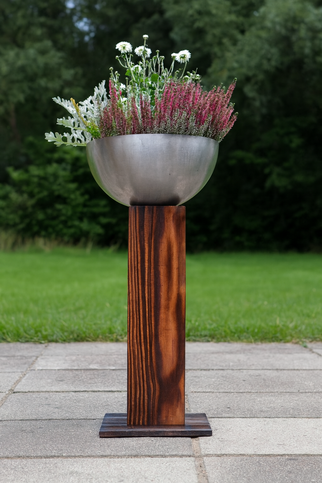 Bringen Sie stilvolle Eleganz in Ihren Garten, Ihre Terrasse oder Ihren Wohnbereich:Unser handgefertigter Pflanzensäulenständer kombiniert einen modernen Edelstahl-Pflanztopf mit einem charaktervollen Holzsockel im Shou-Sugi-Ban-Stil. Das
